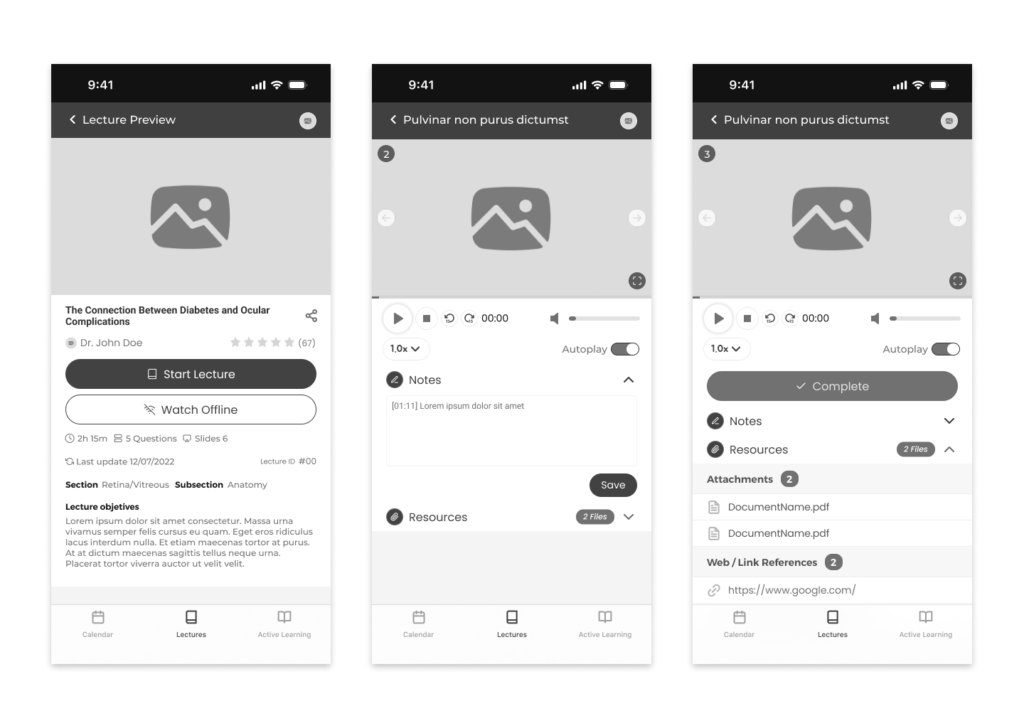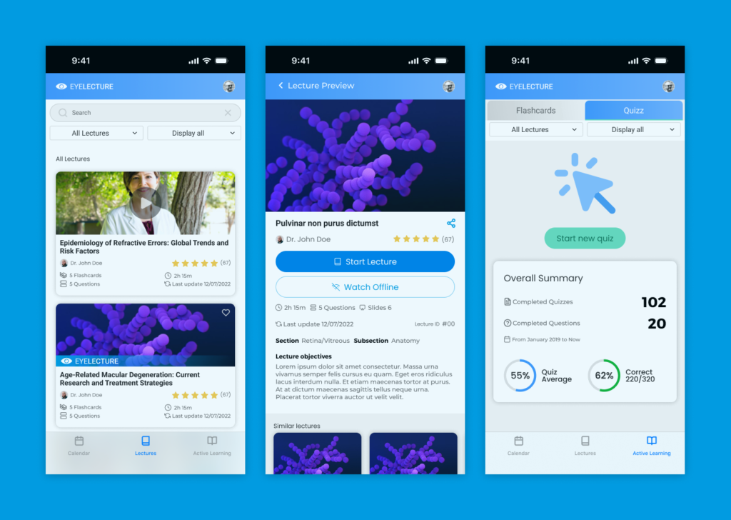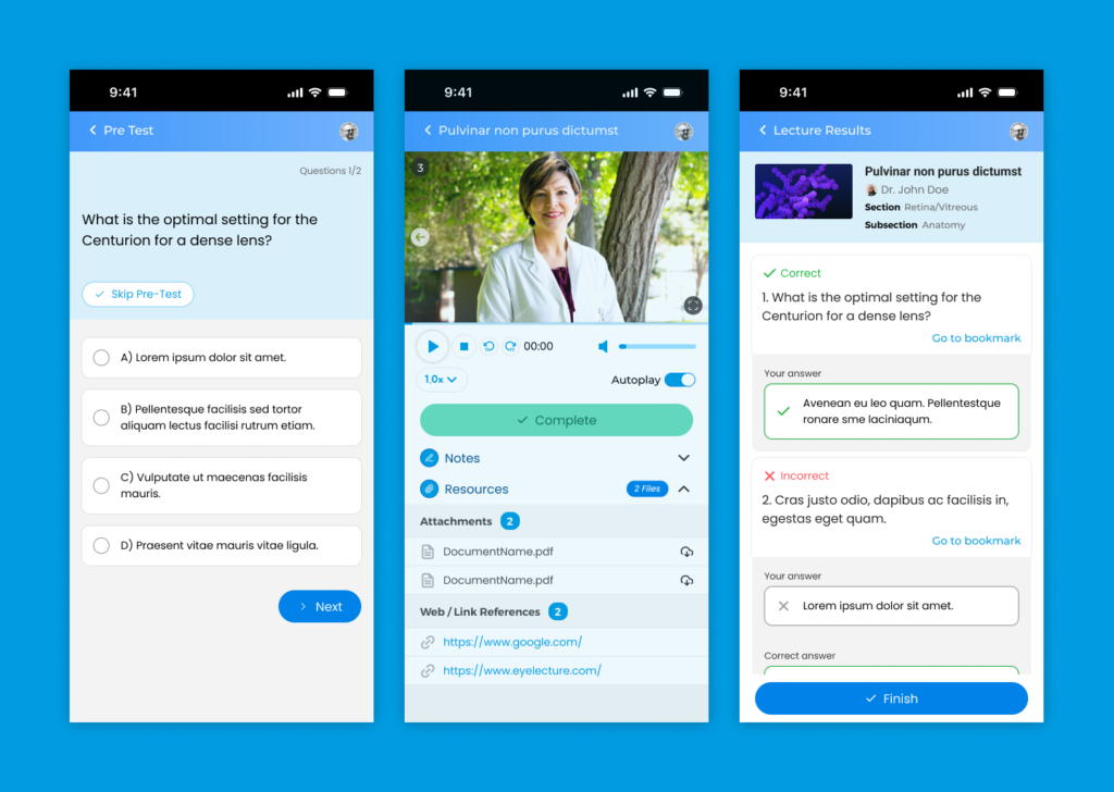 Eyelecture is a cloud-based learning management solution for ophthalmology training. The Eyelecture application is designed for students, allowing them to do their readings at any time. This application allows users to: